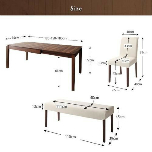 天然木ウォールナット材 伸縮式ダイニングセット ■エクステンションテーブル(W120-150-180)【サイズ】幅120-150-180 奥行75 高さ72cm【材質】天板:天然木ウォールナット材 突板 仕上げ:ウレタン塗装 脚部:天然木ラバーウッド材【商品重量】30kg【梱包数】1梱包【梱包サイズ/重量】130 84 15cm/34kg【生産国】ベトナムまたは中国 ※組立品■カバーリングチェア(2脚組)【サイズ】幅40 奥行48 高さ83(座面高43)cm【材質】フレーム:天然木ラバーウッド材 クッション材:ウェービングベルト、ウレタンフォーム【製品重量】4kg(1脚)【梱包数】1(2脚1梱包)【梱包サイズ/重量】:約85 45 29cm/9kg【生産国】マレーシア※組立品■カバーリングベンチ【サイズ】111 奥行40 高さ45cm【材質】フレーム:天然木ラバーウッド材 クッション材:ウェービングベルト、ウレタンフォーム【製品重量】6kg【梱包数】:1梱包【梱包サイズ/重量】117 45 14cm/7kg【生産国】マレーシア※組立品■カバーリング(チェア・ベンチ共通)【材質】:ポリエステル100%【カラー】ネイビー/アイボリー【梱包数】:1梱包【生産国】中国<チェアセット>■5点セット【セット内容】テーブル、チェア 4■7点セット【セット内容】テーブル、チェア 6<ベンチセット>■4点セット【セット内容】テーブル、チェア 2、ベンチ 1■5点セット【セット内容】テーブル、チェア 2、ベンチ 2■6点セット【セット内容】テーブル、チェア 4、ベンチ 1※サイズ、重量は概算です。
